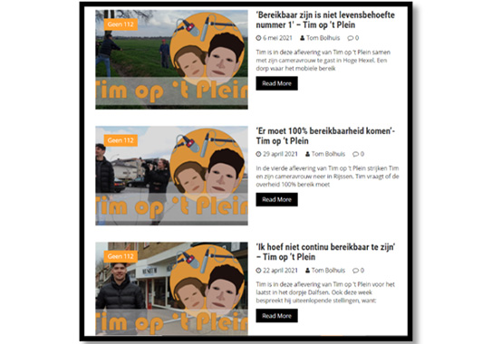 In the province of Overijssel people cannot always call the emergency number (112) because the coverage of cell towers is less than 100%. In some areas of the province this is a problem, especially in case of emergency because people can be deprived of help. During the project the journalists, with the help of the audience/citizens, investigated the seriousness of the problem and which outskirts of the province were badly covered by the network. Citizens, experts and politicians were interviewed for the journalistic production which was published on a website called Publiekplein (public square) and some of the productions were published on the website of the media partner RTVOost.